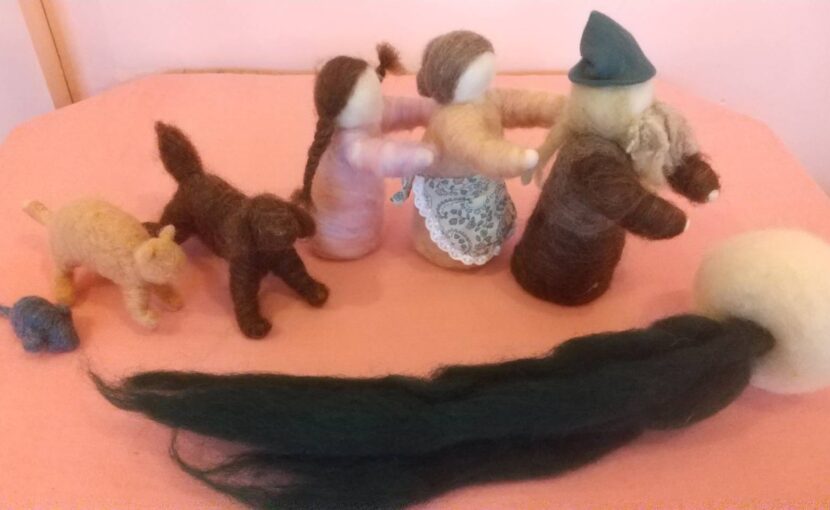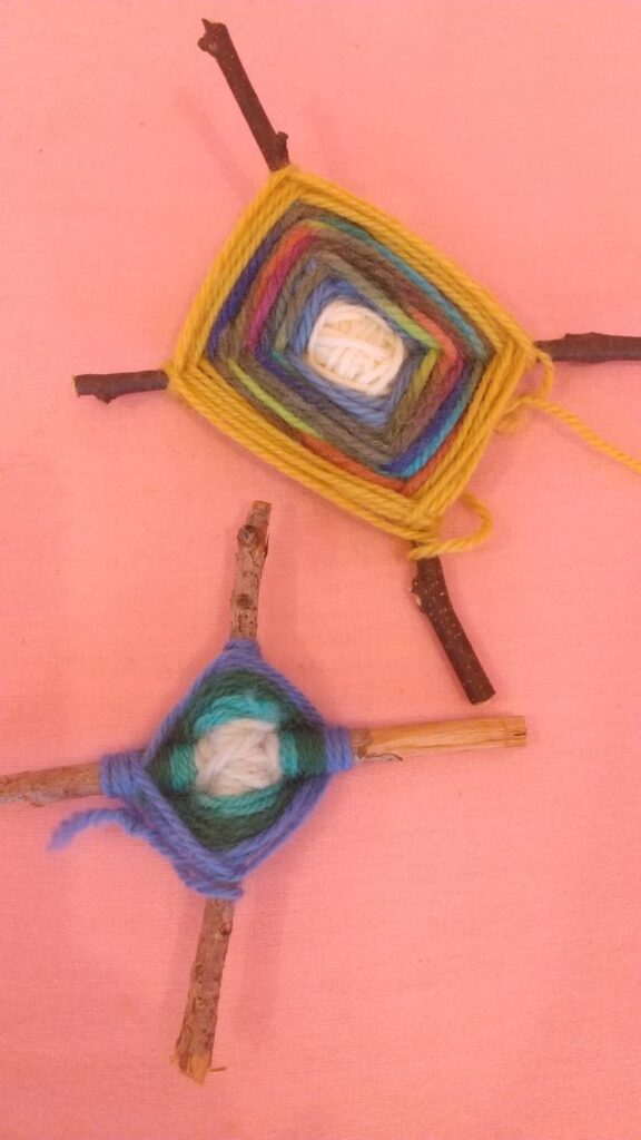 毛糸の手仕事を初めてした年長さんの男の子。没頭しながら、色鮮やかな美しいゴッツアイができました。また園から持っていったお人形を大事に抱っこして可愛がってくれました。また、「おおきなかぶ」の人形劇も行いました。
