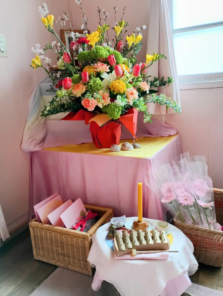 卒園式 2026.03.13 こどもの園 今年は早い雪融けのため、春らしい日差しの卒園式になりました。 園児達は花束を嬉しそうに受け取り、はにかみながら親御さんに届けていました。こどもの園:大石 こどもの園 ビーツ、ヨモギで手作り菱餅&おやつ3色団子で雛祭りをお祝い前の記事