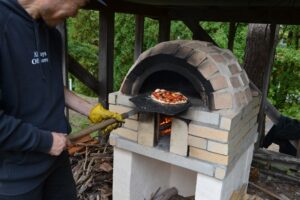 ↑トマトとチーズの香りが漂う、手作り窯での窯焼きピザ