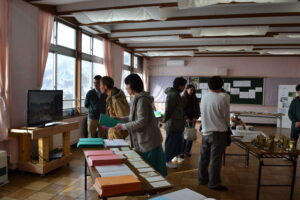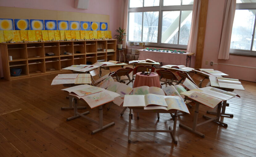 窓の外には雪景色が広がり、校舎の中は子どもたちの作品の光でいっぱい。 ご観覧の皆さまが静かに作品に見入り、教師の説明にうなずきながら笑顔で話す様子は、まさに「共同体で育てる教育」の象徴でした。