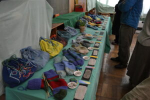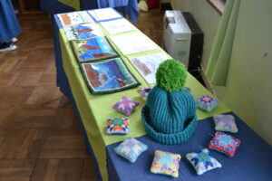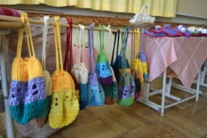 手仕事のコーナーでは、編み物の温かさが溢れていました。 カラフルな巾着袋や、ふわふわの帽子、星や花の模様が入ったピンクッション、そして木の洞窟から顔をのぞかせる手編みのリスやクマの家族……。 一本一本の糸を丁寧に編みながら育まれる集中力と想像力に、保護者の皆さまからも「すごいね!」という感嘆の声が上がっていました。
