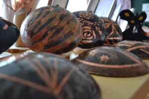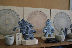 教室に入った瞬間、目に入るのは色とりどりの美しい作品の数々。 壁一面に広がる幾何学的な弦アートや、古代の土偶を思わせる力強い陶器のフィギュアたち。 まるで歴史と芸術が溶け合ったような展示に、思わず息をのみます。
