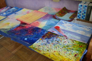 ノートを開けば、まるで美術書のように丁寧に描かれたレオナルド・ダ・ヴィンチの肖像画や、自由で鮮やかな水彩画のページが次々と現れます。 抽象的な色彩の遊びから、季節の移ろいを繊細に捉えた風景画まで——子どもたちの感性がそのまま紙の上に息づいています。